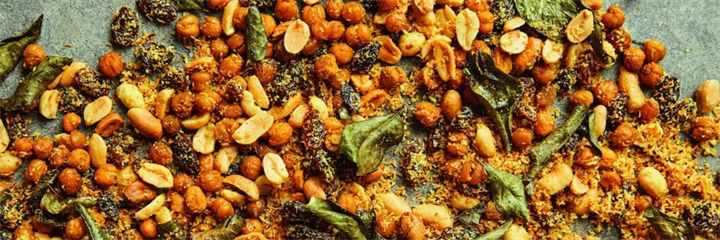 crunchy oven baked bombay mix with spiced chickpeas peanuts coconut and curry leaves a delicious high fibre vegan snack perfect for sharing and easy to make at home.