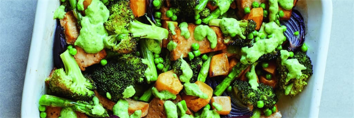 Crisp-roasted tofu and seasonal greens over sweet butternut squash, finished with a creamy herb-packed green goddess tahini dressing. Weeknight-easy, vibrant and satisfying.