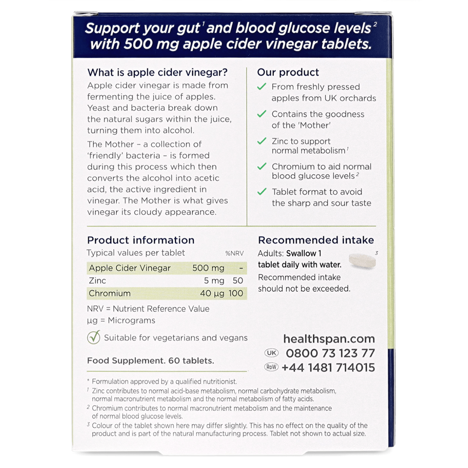 The juice used in our tablets is from freshly pressed, specially selected orchard apples. Unlike filtered alternatives, ours preserves “The Mother”, the raw, living culture formed during natural fermentation that gives apple cider vinegar its unique vitality. We’ve also included chromium, which supports the way your body processes fats, carbs and proteins, and zinc, which plays a vital role in energy pathways and acid-base balance. Best of all, our tablets remove the harsh taste and potential damage to teeth and throat that drinking apple cider vinegar can cause, offering a clean, convenient and gentle way to enjoy all the benefits.
