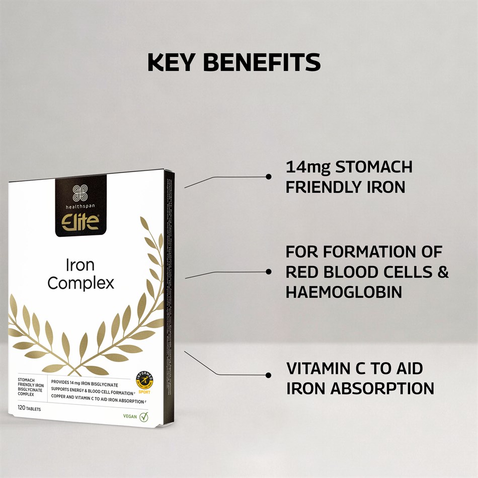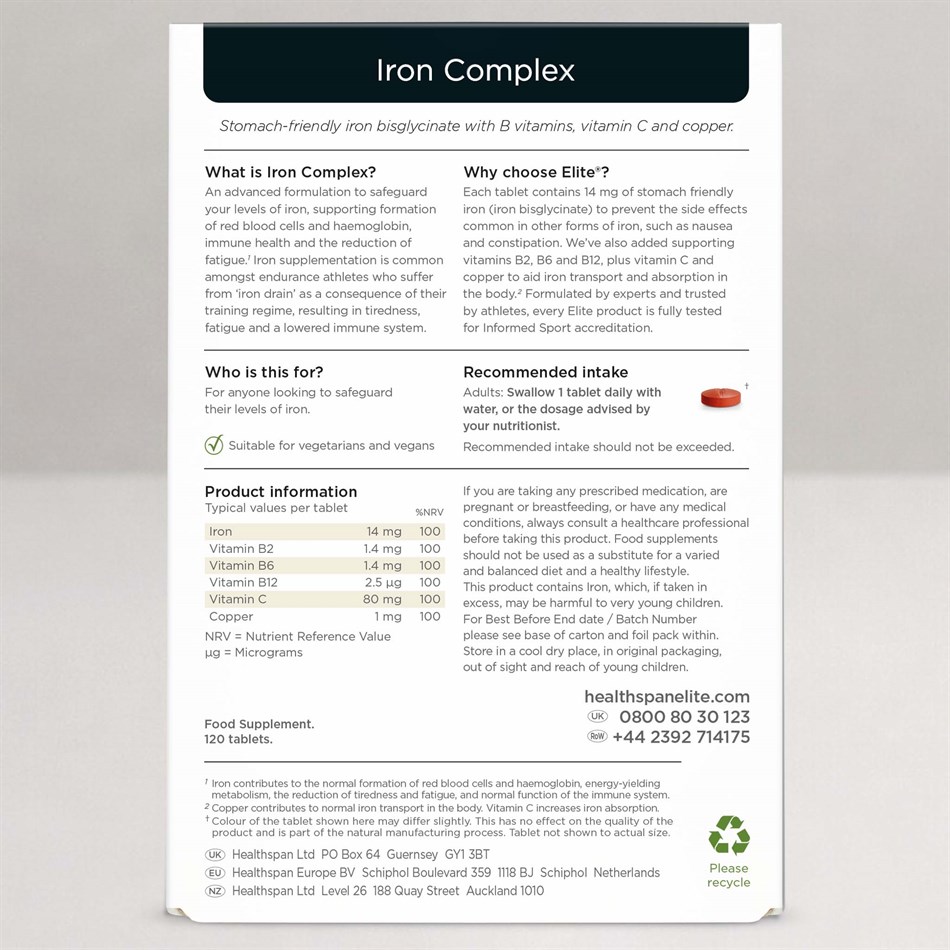 Each Iron Complex tablet contains 14 mg in the ‘stomach friendly’ bisglycinate form. Other forms of iron are often associated with side effects such as nausea and constipation, iron bisglycinate helps to prevent some of these common side effects.