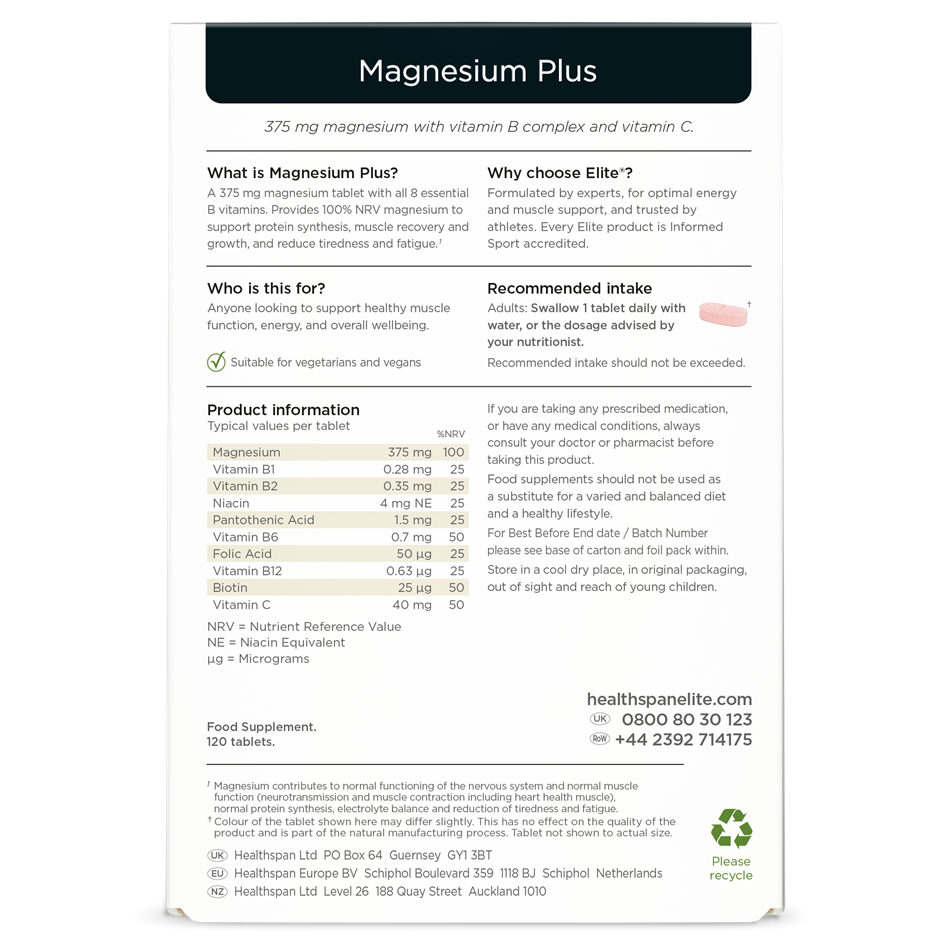 Magnesium plays a number of important roles within the body and is also crucial for protein synthesis which is vital for the growth of muscles. Each Magnesium Plus tablet delivers 375mg of magnesium as well as the entire family of B vitamins and at only 10p per day offers exceptional value for money.
