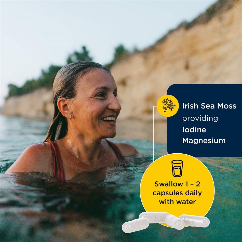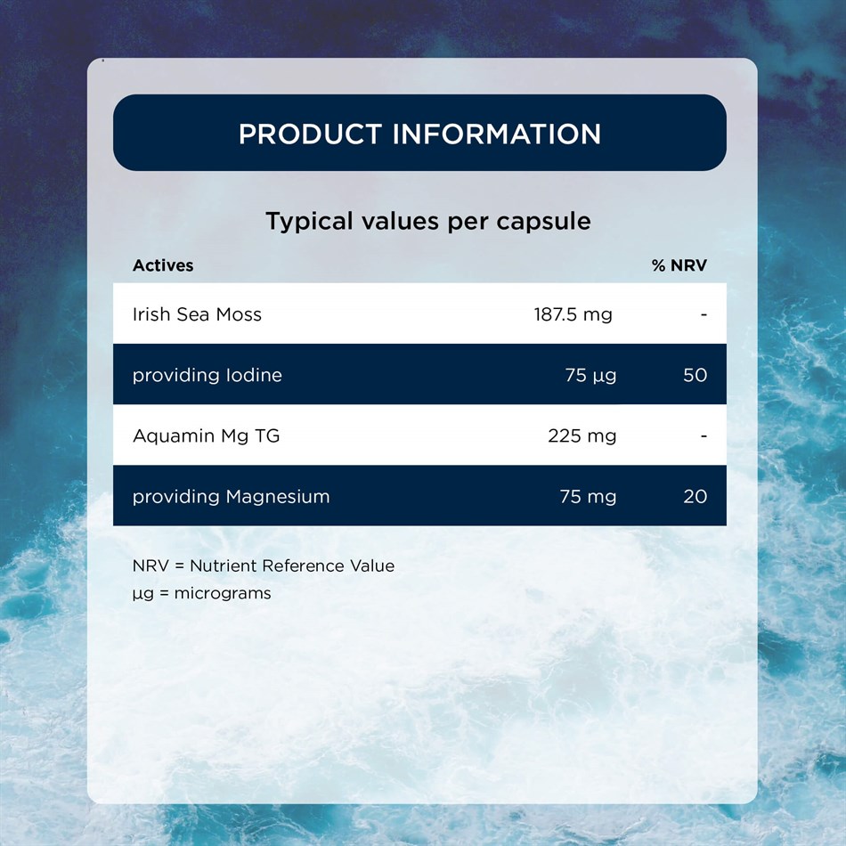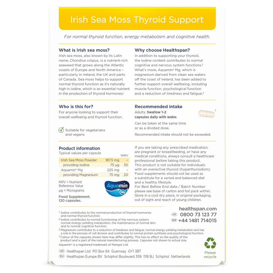 In addition to supporting your thyroid, the iodine content contributes to normal cognitive and nervous system functions. What’s more, Aquamin® Mg, which is magnesium derived from clean sea waters off the coast of Ireland, has been added to further support overall wellbeing, including muscle function, psychological function and a reduction of tiredness and fatigue.