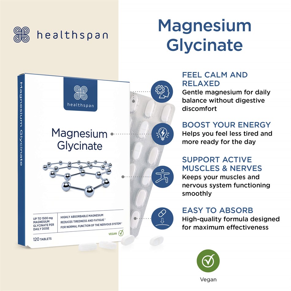 At Healthspan, we believe in providing premium-quality supplements backed by science. That is why we have formulated Magnesium Glycinate to support your daily wellbeing. Each daily dose provides 1000 - 1500 mg magnesium glycinate, which is equivalent to 200 - 300 mg elemental magnesium. Binding magnesium to the amino acid glycine makes it highly bioavailable, better absorbed and better tolerated in the digestive system.