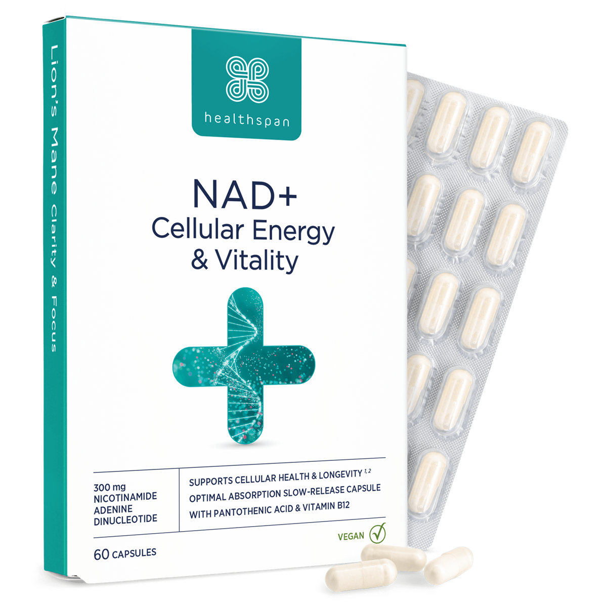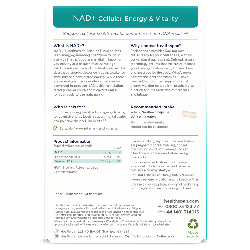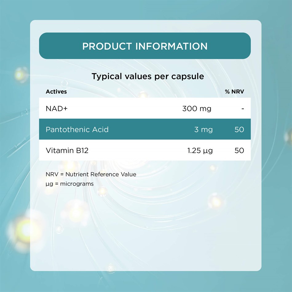 Each capsule provides 300 mg pure NAD+ ready for your cells to use, with no conversion steps required. Delayed release technology ensures that the NAD+ reaches your lower gut before being broken down and absorbed by the body. What’s more, pantothenic acid and vitamin B12 have been added to further support normal energy-yielding metabolism, psychological function and the reduction of tiredness and fatigue.1 2