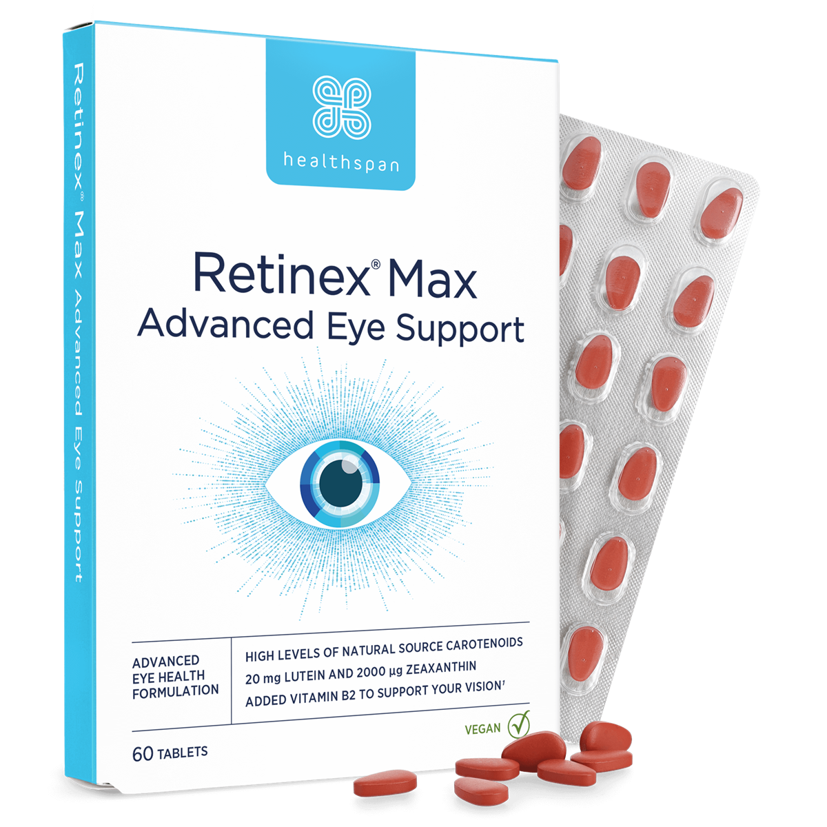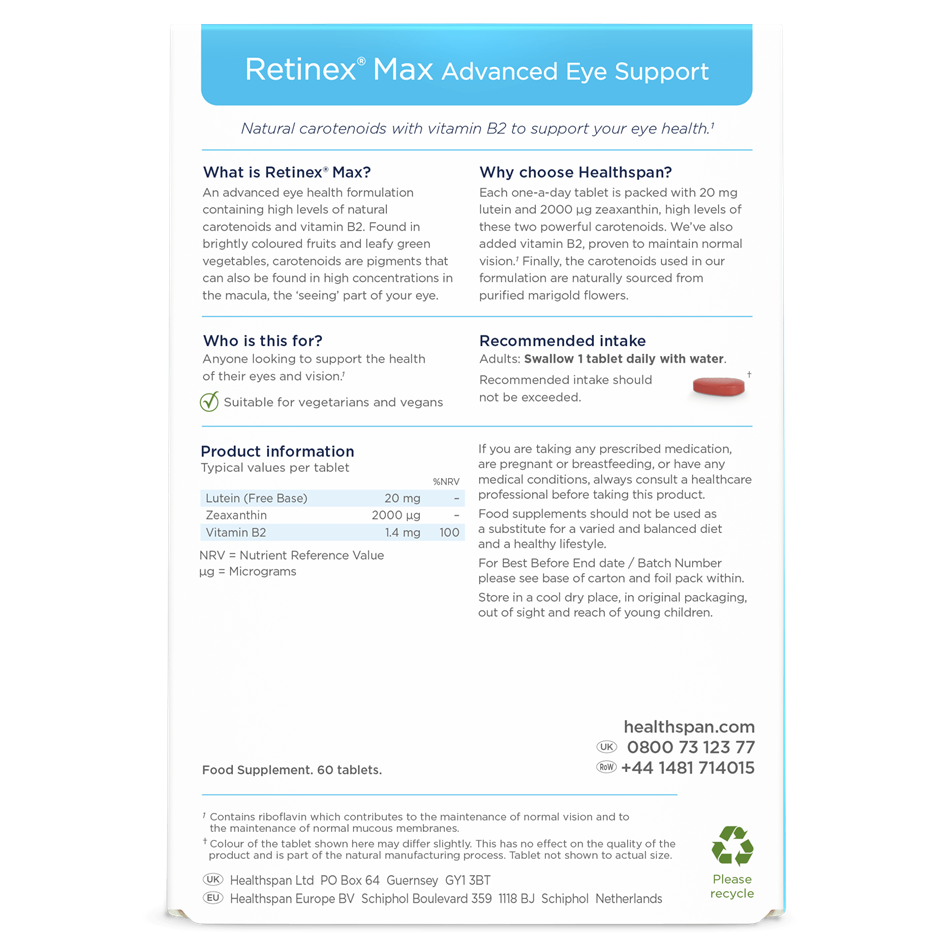 Retinex® Max is designed to offer superior support for your eye health with a carefully crafted formulation. We include Vitamin B2 (Riboflavin), which is proven to contribute to normal vision and acts as a potent antioxidant. This helps protect your eyes from oxidative stress caused by everyday environmental factors, such as exposure to pollution and UV light. In addition, our lutein and zeaxanthin are sourced naturally from marigold flowers and undergo a standardised extraction process to ensure consistent purity and potency. Each vegan tablet contains 20 mg of lutein and 2,000 µg of zeaxanthin, which are ideal amounts for supporting healthy vision and protecting your eyes from harmful blue light. This thoughtful combination ensures that Retinex® Max delivers the best possible protection and nourishment for your eyes, making it a superior choice for maintaining your vision.