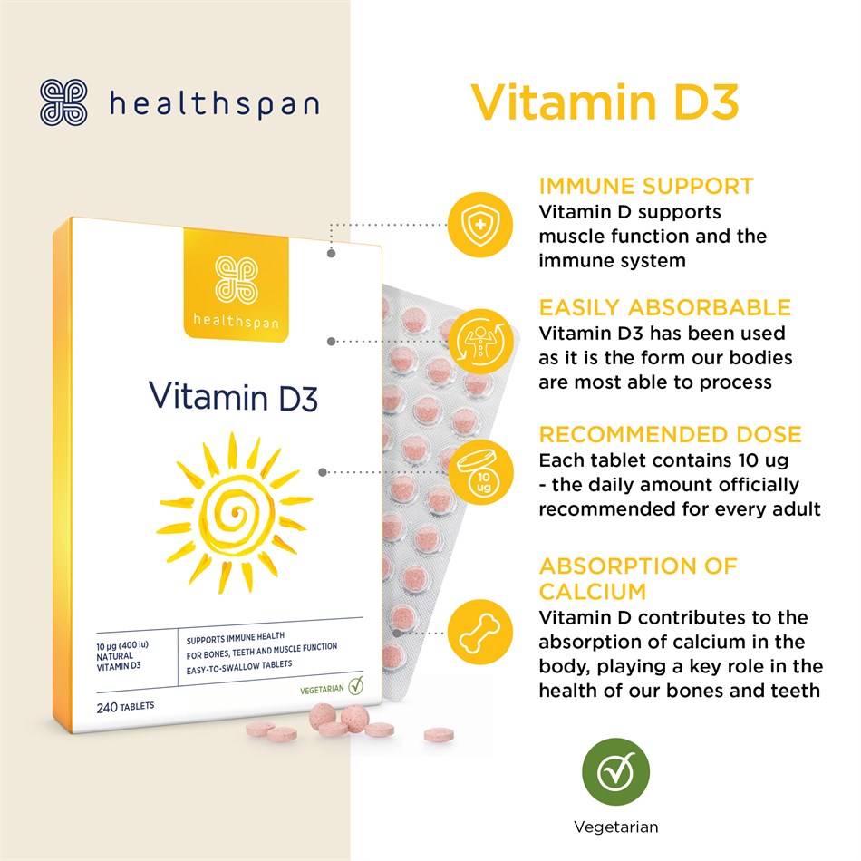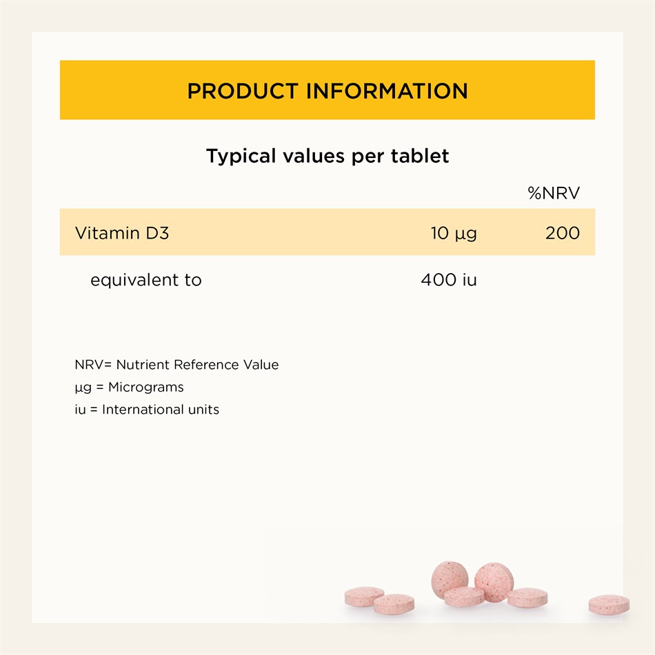 Unlike some vitamin D supplements, we use vitamin D3, which is the form our bodies are most able to process. Each tablet contains 10µg (400iu).
